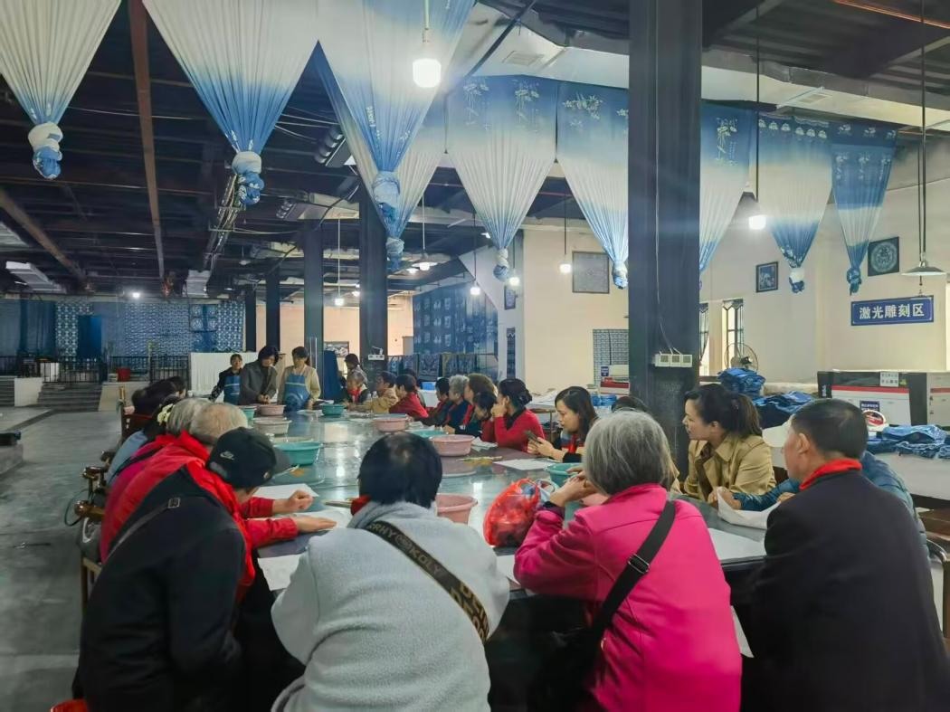 活动当天,离退休职工们怀着期待的心情走进蓝印花布非遗基地。在专业讲解员的引导下,老同志们先后参观了蓝印花布历史文化展厅、制作工坊,化身“好奇宝宝”,详细了解蓝印花布从脱脂、描稿、刮浆到染色、晾晒的完整制作流程。一幅幅色彩素雅、图案精美的蓝印花布作品,从传统纹样到现代创意设计,让老同志们深切感受到了千年非遗的匠心与智慧。更能亲手尝试扎染等简易工序,感受指尖上的千年技艺,将专属的蓝印作品作为重阳节纪念。